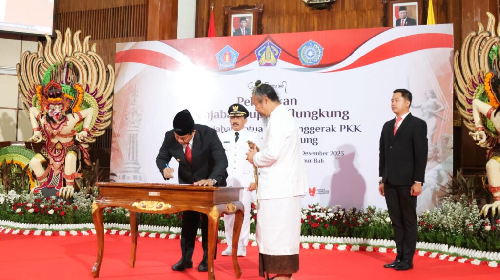 DENPASAR – Penjabat (Pj) Gubernur Bali S.M. Mahendra Jaya melantik dan mengambil sumpah jabatan I Nyoman Jendrika sebagai Pj. Bupati Klungkung dalam prosesi pelantikan yang berlangsung di Ruang Wiswa Sabha Utama Kantor Gubernur Bali, Sabtu (16/12/2023). Jendrika yang sebelumnya menjabat sebagai inspektur di Pusat Pelaporan dan Analisis Transaksi Keuangan (PPATK) mengisi posisi sebagai Penjabat Bupati Klungkung hingga dilantiknya Bupati dan Wakil Bupati definitif hasil Pemilukada Tahun 2024. Prosesi pelantikan diawali dengan pengucapan sumpah jabatan yang dipandu oleh Pj. Gubernur Bali, dilanjutkan penandatanganan berita acara pengucapan sumpah jabatan dan fakta integritas. Prosesi berikutnya adalah pemasangan tanda pangkat, penyematan tanda jabatan dan penyerahan SK Mendagri.