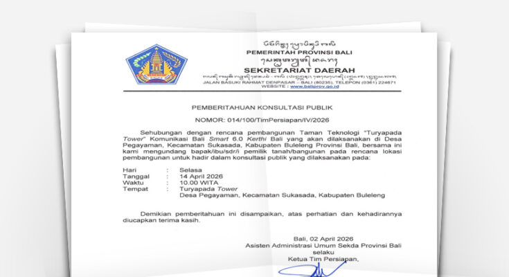 Sehubungan dengan hal tersebut, Pemerintah Provinsi Bali mengundang pemilik tanah dan/atau bangunan pada rencana lokasi pembangunan untuk hadir dalam kegiatan Konsultasi Publik yang akan dilaksanakan pada *Selasa, 14 April 2026, pukul 10.00 WITA, bertempat di kawasan Turyapada Tower, Desa Pegayaman, Kecamatan Sukasada, Kabupaten Buleleng. Pemberitahuan ini tertuang dalam **Pemberitahuan Konsultasi Publik Nomor 014/100/TimPersiapan/IV/2026* tertanggal *2 April 2026. Detail data bidang tanah dapat dilihat di **Kantor Desa Pegayaman, Kecamatan Sukasada, Kabupaten Buleleng*.