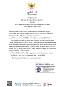 Pengumuman PENGUMUMAN B.21.500.15/17588/IV/DISNAKER.ESDM TENTANG UPAH MINIMUM PROVINSI DAN UPAH MINIMUM SEKTORAL PROVINSI BALI TAHUN 2026 25 Desember 2025 Post navigation Previous Press Release: PENETAPAN UMP DAN UMSP BALI TAHUN 2025
