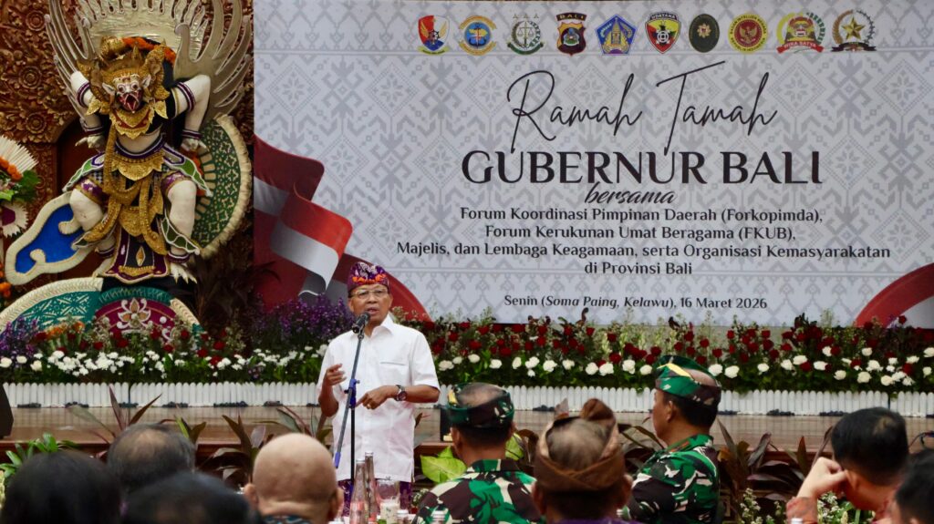 Denpasar – Gubernur Bali Wayan Koster menggelar ramah tamah dalam rangka menyambut hadirnya Hari Raya Nyepi Tahun Çaka 1948 yang hampir bersamaan dengan Hari Raya Idup Fitri 1447 Hijriah, guna mempererat hubungan Silaturahmi serta meningkatkan sinergi antara Pemprov Bali dengan Unsur Forkopimda, FKUB, Majelis dan Lembaga Keagamaan serta Organisasi Masyarakat bertempat di Gedung Kertha Sabha, Jayasabha, Denpasar, Senin (16/3).